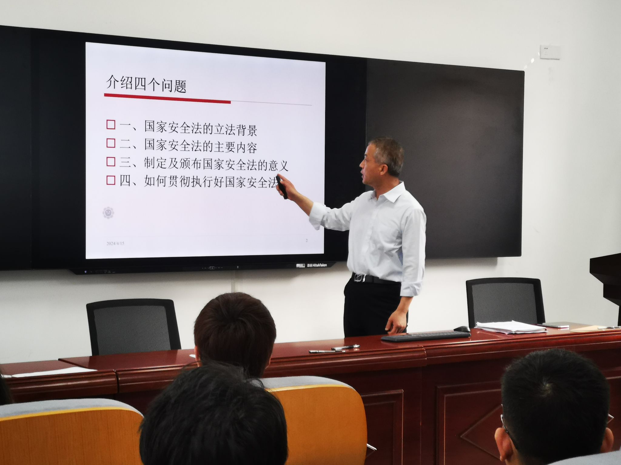 4月15日,休闲小栈 在龙赛理科楼北楼314报告厅举办2024年全民国家安全教育宣讲会,学院党政领导、组织员、学生党建辅导员、各教工党支部书记、学院党建中心各负责人参加,会议由学院党委书记朱学庆主持并宣讲。