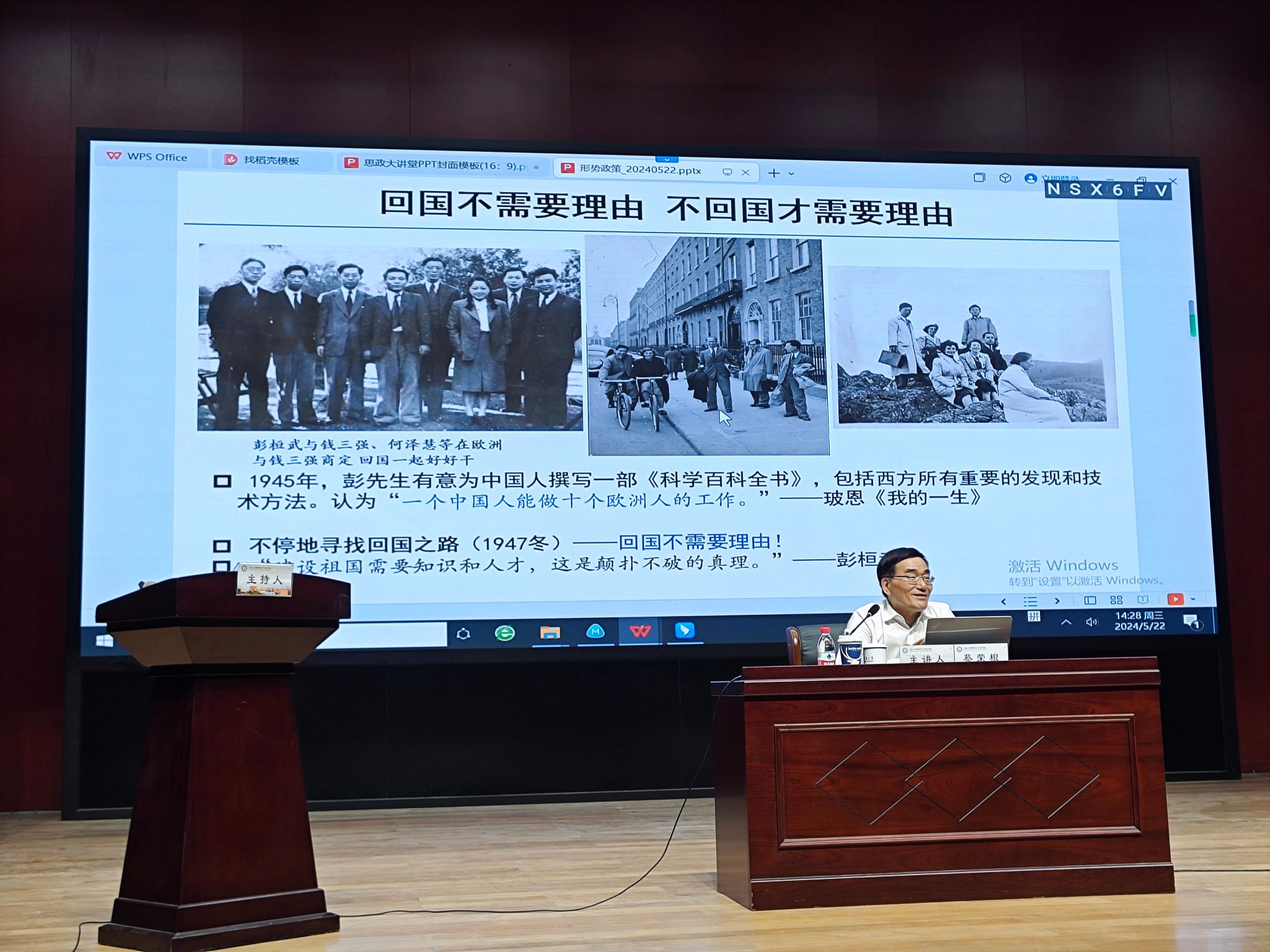 5月22日,校长蔡荣根院士在忻元甫报告厅以“弘扬科学家精神——以彭桓武先生为例”为主题,为休闲小栈 和阳明学院440余名师生讲授“形势与政策”课。