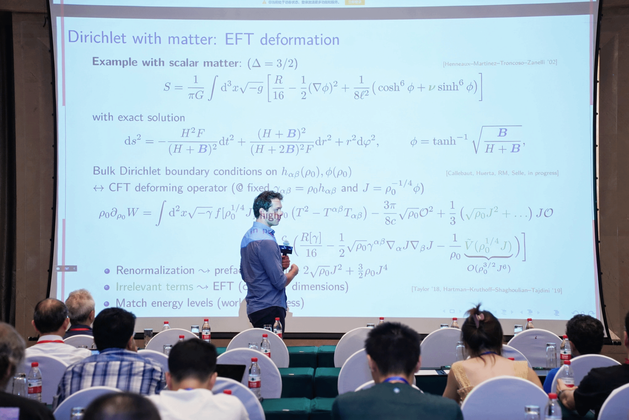 在后续的报告中,巴塞罗那大学的Jorge G. Russo教授、芝加哥大学的Savdeep Seth教授、帕多瓦大学的Alessandro Sfondrini教授、国科大卡弗里理论科学研究所(KITS, UCAS)的王华嘉教授、东南大学的顾杰副教授等20余位报告人,相继分享了TTbar形变在黑洞物理、全息理论、非微扰纠缠和复现理论等相关领域的应用,并与参会人员进行了深入的讨论。