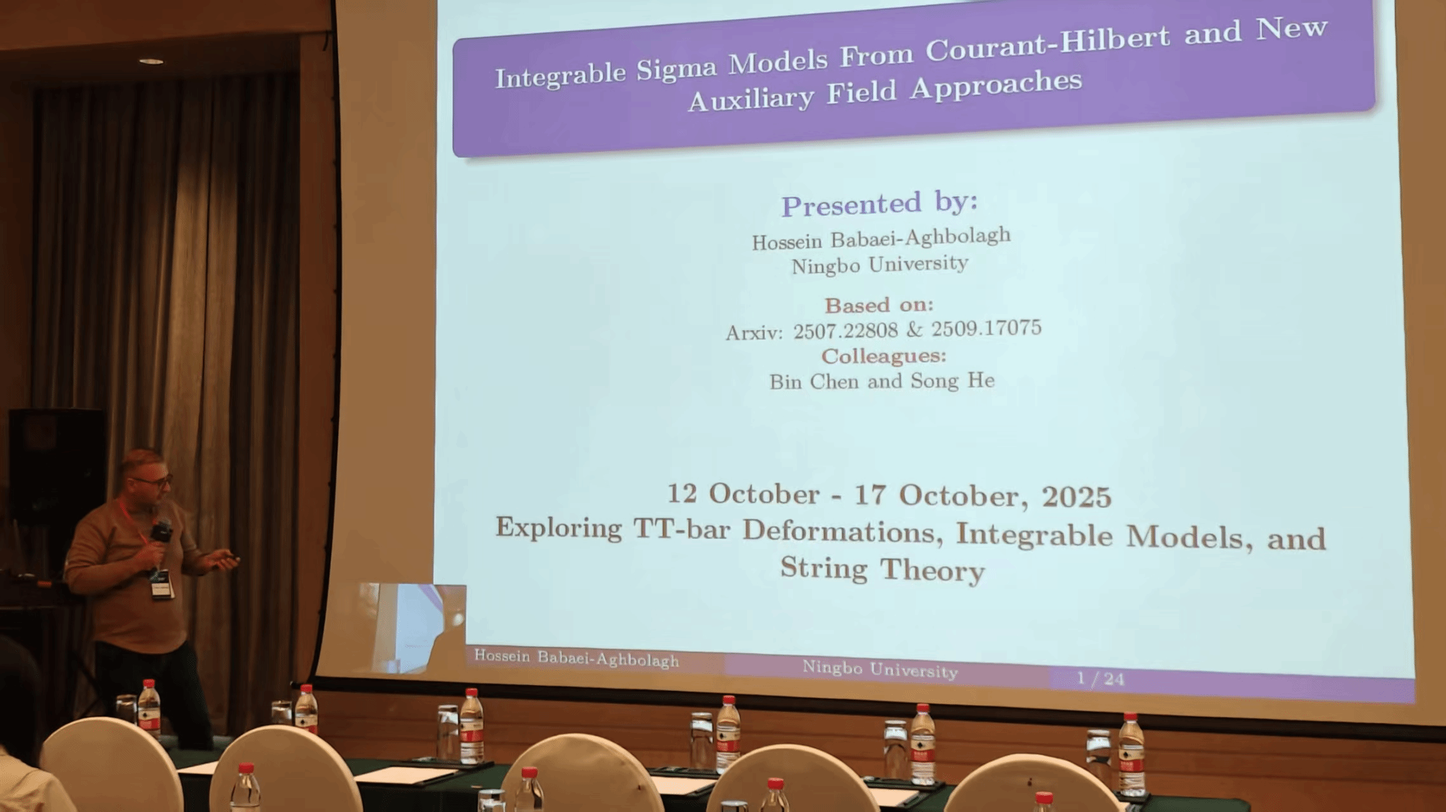 10月12日至17日,由休闲小栈 基础物理与量子科技研究院主办的“探索TTbar形变、可积系统与弦理论”——Exploring TTbar Deformations, Integrable Models, and String Theory——国际学术会议,在浙江宁波举行。本次会议由休闲小栈 的陈斌教授,陈霖教授,何松教授,Hossein Babaei-Aghbolagh博士,都灵大学的Roberto Tateo教授,清华大学的宋伟教授,以及东南大学的江云峰教授联合组织。会议吸引了来自中国、美国、英国、西班牙、意大利、澳大利亚、日本等国家的50余位专家和学者,共同讨论TTbar形变研究的最新进展和未来发展方向。