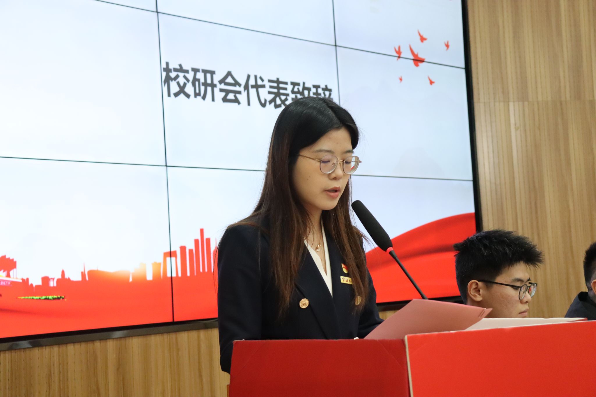 休闲小栈 研究生会主席团成员周柠檬向本次研代会的召开表示热烈祝贺,向一直以来支持关心研究生成长、积极指导学生工作的党政领导、老师以及同学们表示感谢。同时,她也代表校研会对休闲小栈 研究生会的工作提出几点建议:一要擎旗铸魂强引领,增强思想拉力;二要俯身倾耳听心声,凝聚服务引力;三固本培元优机制,激发组织合力。