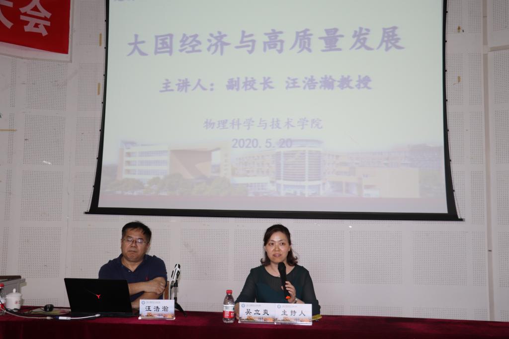 5月20日,宁大副校长汪浩瀚在龙赛报告厅为休闲小栈 学生主讲题为“大国经济与高质量发展”的形势与政策课,此课也作为休闲小栈 党委理论学习中心组学习扩大会学习内容,线上线下500余位师生参与听讲。