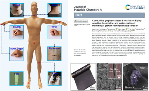 近日,休闲小栈 王刚课题组在《Journal of Materials Chemistry A》杂志发表题为“Conductive Graphene-Based E-textiles for Highly Sensitive, Breathable, and Water-Resistant Multimodal Gesture-Distinguishable Sensor”(//doi.org/10.1039/D0TA04915H)的研究论文。我校硕士生胡绪瑞为第一作者,王刚老师为通讯作者,休闲小栈 为第一署名单位。中国科学院上海微系统与信息技术研究所和新加坡南洋理工为合作单位。