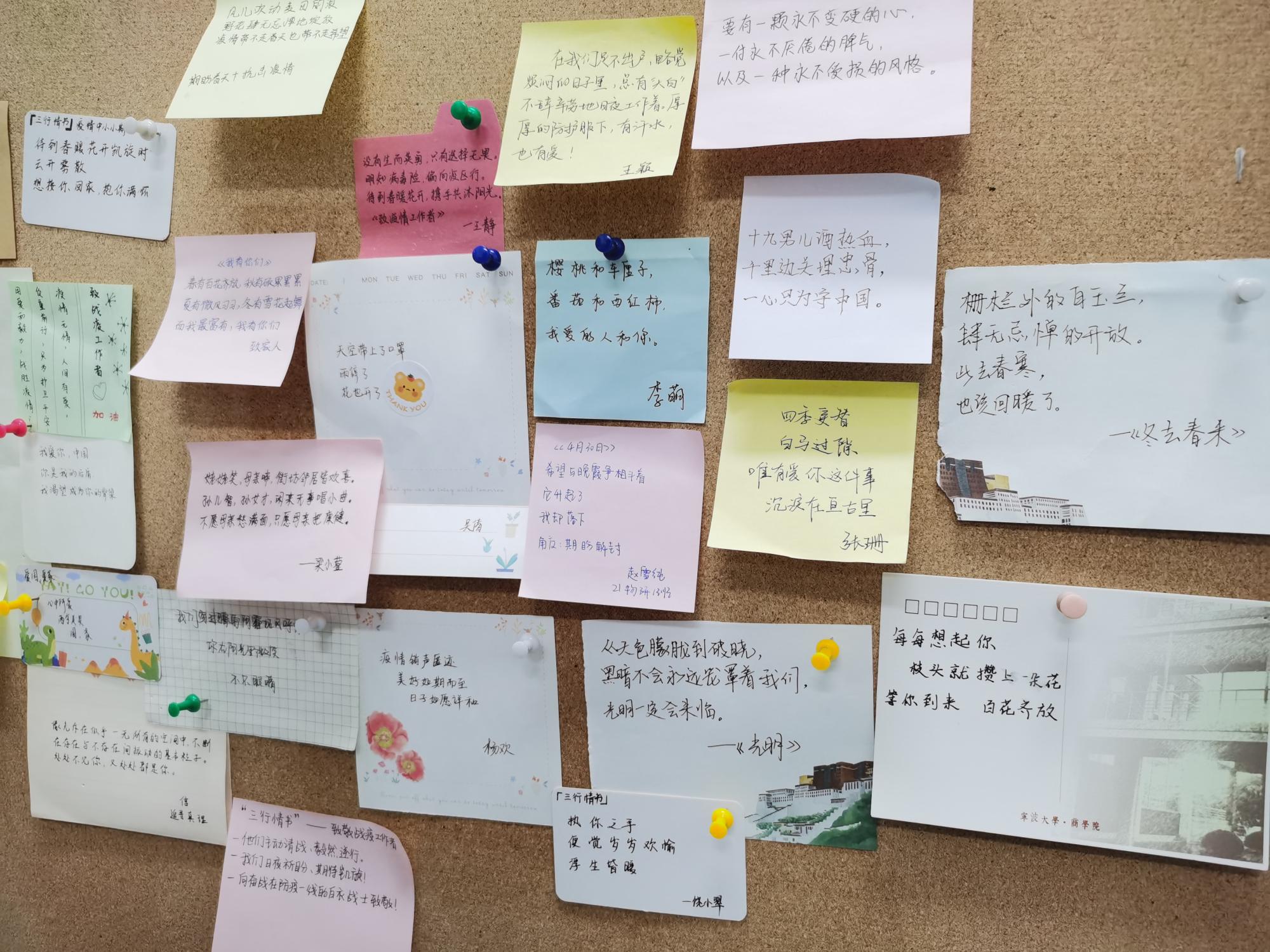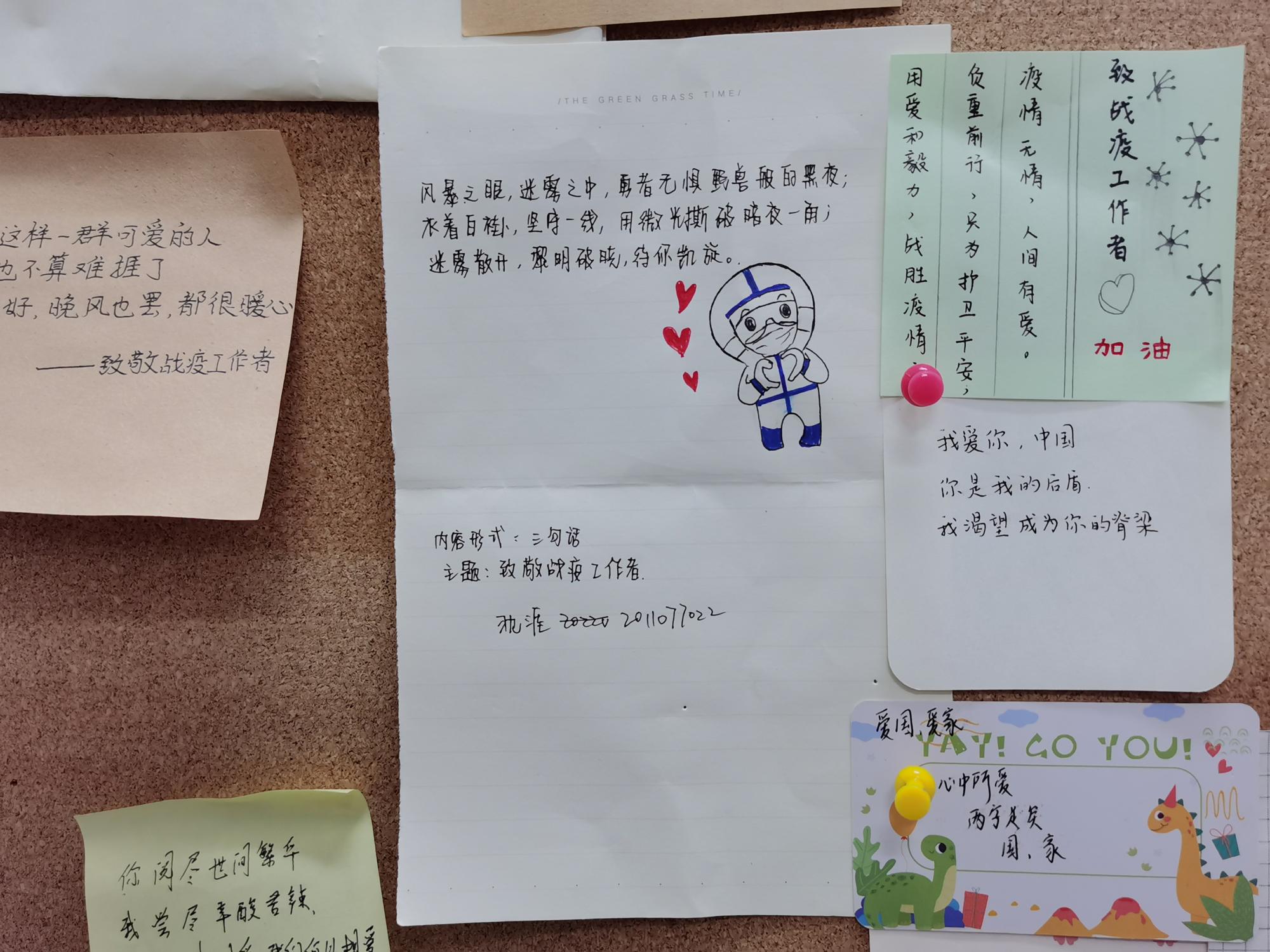 活动发起后,同学们积极参与投稿,累计收到投稿近百份。经初步审核,共筛选相关作品三十余份,所选作品均字迹工整、感情充沛、文笔优美。物院学子对党、对国家、对疫情志愿者及家人朋友最真挚的情感跃然纸上,在思想上和行动上高度践行了学院举办本次活动的初衷。投稿截止后,优秀作品在休闲小栈 微信公众平台展出。