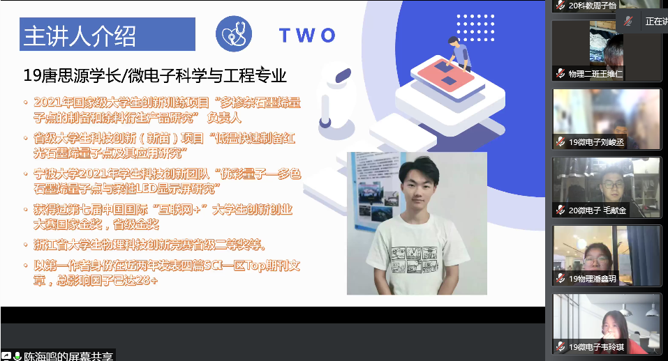 习近平总书记提出 “广大青年要肩负历史使命,坚定前进信心,立大志、明大德、成大才、担大任,努力成为堪当民族复兴重任的时代新人,让青春在为祖国、为民族、为人民、为人类的不懈奋斗中绽放绚丽之花”。为营造全院浓厚的科研创新文化氛围,激发青年科研创新灵感与热情,服务于青年科技创新工作,引领广大青年学子崇尚科学、追求真知,助力学校双一流建设。休闲小栈 2022年“启智未来”大学生科研创新文化活动暨大学生科研育苗分享会休闲小栈 专场于2022年5月15日晚在线上成功举办。