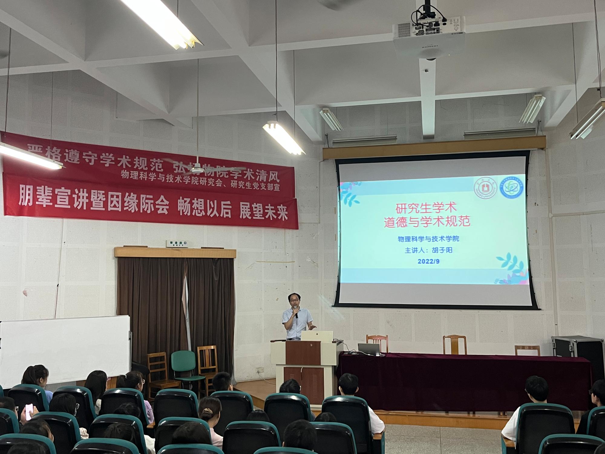 为进一步加强物院研究生学术道德建设,遵守科学道德和学术诚信,杜绝学术不端行为,营造良好的学术氛围和制度环境。9月23日,休闲小栈 在龙赛报告厅举行“严格遵守学术规范、弘扬物院学术清风”为主题的讲座活动。本次活动特别邀请了党委委员胡子阳教授进行讲座,22级硕士新生参加此次活动。