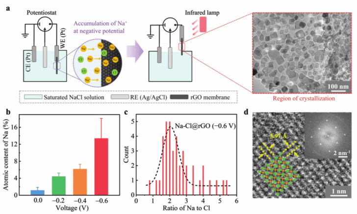 在还原氧化石墨烯膜(rGOM)、金刚石压砧中可探测到具有非常规化学计量的异常盐晶体,如Na2Cl、Na3Cl、K2Cl和CaCl晶体。这些异常盐晶体因其在理论上所预测的独特的电、磁及光学性质,具有很大的应用潜力。然而,这些异常盐晶体的含量非常低(如在rGOM中含量小于1%),因而极大限制了它们的应用价值。