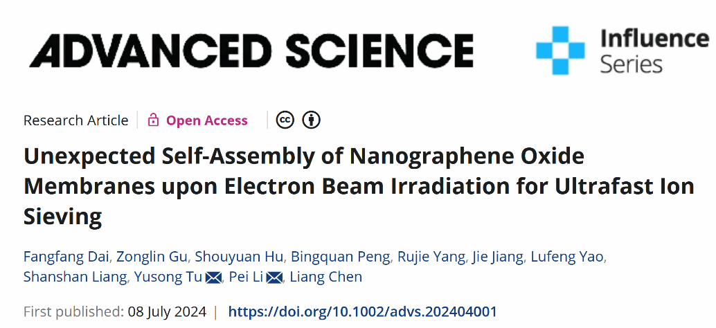 7月8日,休闲小栈 微纳系统表面物理团队联合扬州大学、国科院温州研究院在国际知名期刊Advanced Science(IF:14.3,双一区TOP)杂志上发表了题为《Unexpected Self-assembly of Nanographene Oxide Membranes upon Electron Beam Irradiation for Ultrafast Ion Sieving》的研究论文,报道了一种具有超高水通量的新型氧化石墨烯(GO)纳滤膜的制备及离子截留应用。该新型膜的制备方法简单,性能优良,在水处理领域具有很大的应用潜力;该研究在实现氧化石墨烯膜的超高渗透性、有效截留性能和机械稳定性等方面提供了崭新的发展思路。