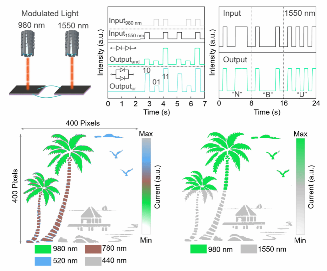 基于二维材料的光电探测器受限于低光捕获效率和高暗电流等关键科学问题,研究团队从材料获取、结构设计与制造、器件性能调控和物理机制等方面开展系统的研究。通过等离子体辅助化学气相沉积(PACVD)技术,将氮原子引入三维石墨烯结构并构建了垂直型硅基肖特基异质结宽带光电探测器,展现了其在逻辑器件和图像传感器中的应用。三维石墨烯具有天然的纳米谐振腔可显著提高光子捕获效率,氮原子的引入可精细调节异质结的电子结构。通过实验验证理论,理论(时域有限差分和第一性原理)指导器件的构建并阐明了该结构中静态/动态的电荷移动动力学过程。该光电探测器具有优异的宽光谱(400-1550 nm)和自驱动性能。1550 nm波段的光响应度达79.6 A/W,比探测率高达1013 Jones且响应时间仅为130 μs。该探测器可用于逻辑电路和高分辨率模式图像识别领域。该研究工作为新型光电探测器的结构设计、多模式探测和多功能应用提供重要的科学参考价值。