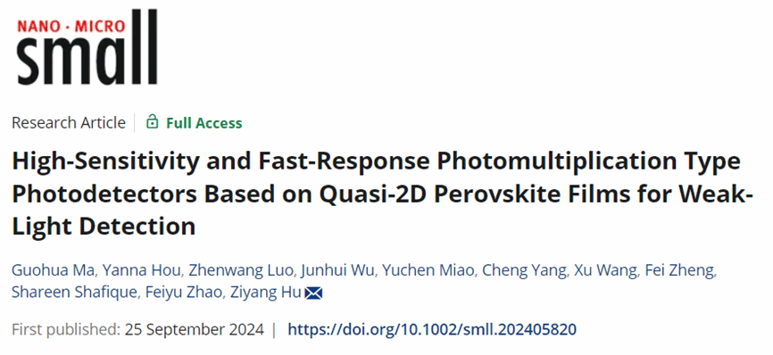 胡子阳教授领衔的课题组在准二维钙钛矿光电探测器领域取得了显著的科研成果。该团队的研究论文 “High-Sensitivity and Fast-Response Photomultiplication Type Photodetectors Based on Quasi-2D Perovskite Films for Weak-Light Detection” 在国际知名学术期刊《Small》上发表。论文的第一作者是休闲小栈