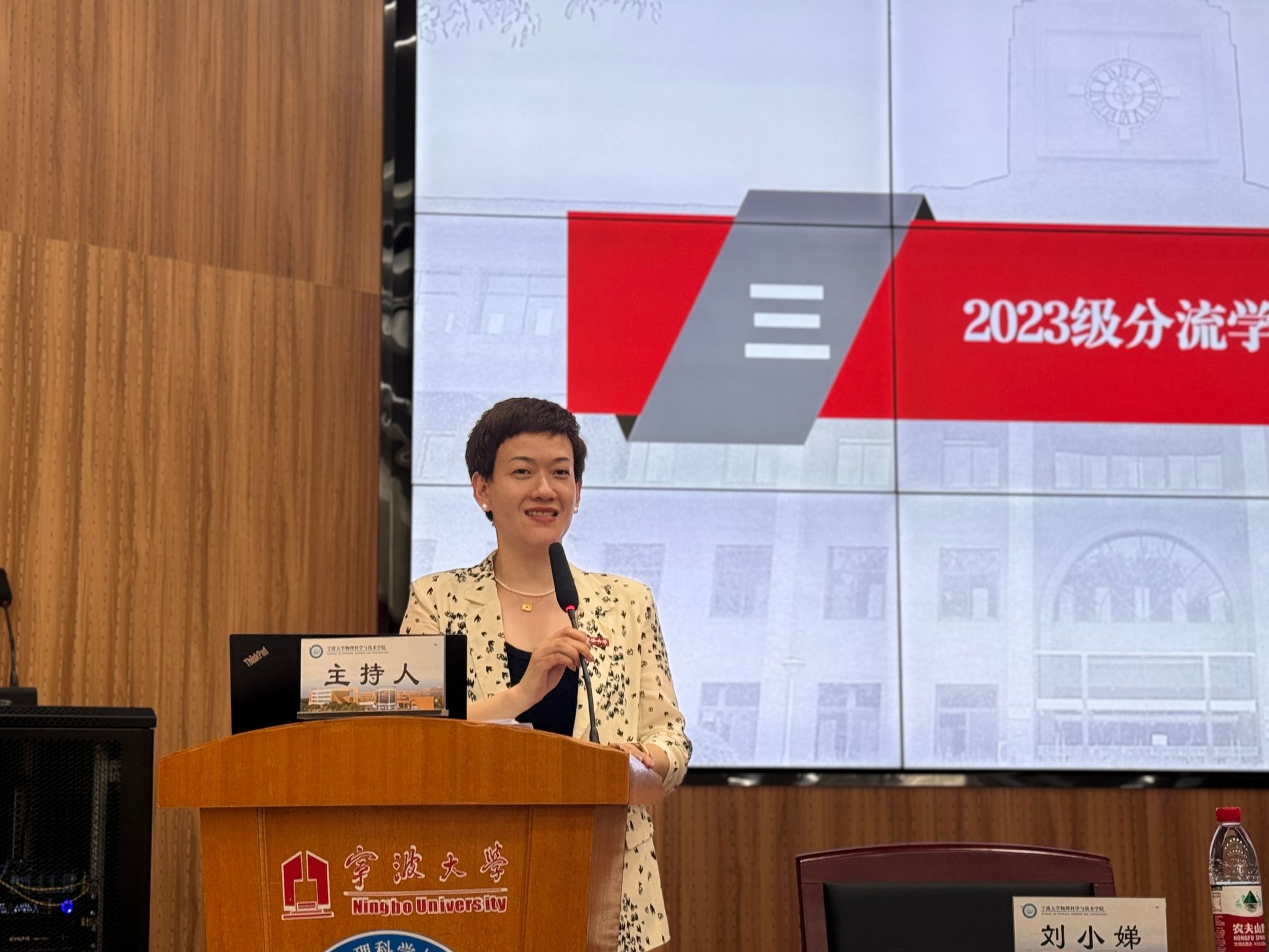 在随后的分流学生代表发言中,2023级微电子班的陈惠婷同学回顾大一、展望未来。她表示,思维的碰撞和多样的专业见解让她受益匪浅,物理学科的深邃广泛使她沉醉其中,她将与在座的各位同学一起立定鸿鹄之志、勤学善思,践行知行合一之念、锐意进取,铸就德行才艺之基。