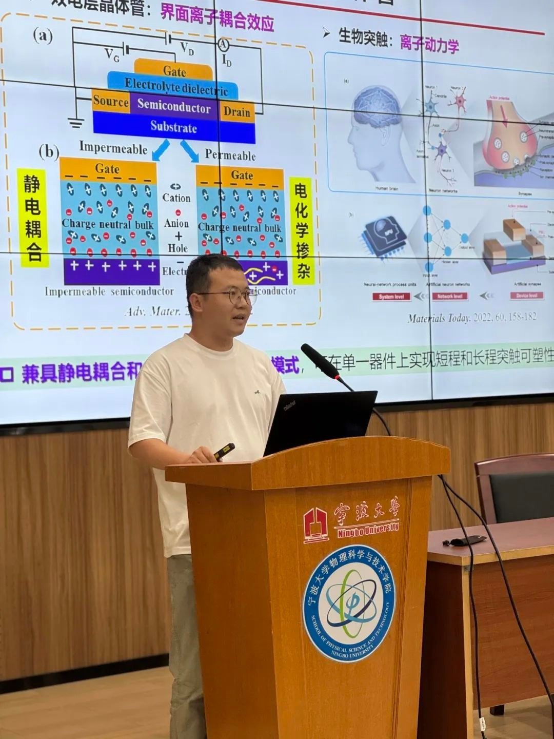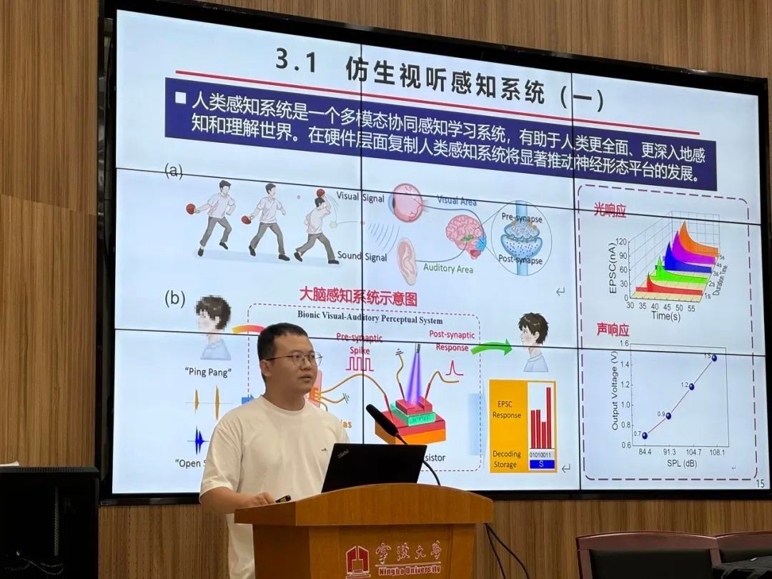 在随后的报告中,王伟胜从理论研究到实验实现,层层递进地分析了生物突触功能模拟及其在智能感知平台中的重要性。他还展示了团队的阶段性科研成果,包括发表了多篇高水平SCI论文,并申请了一项国家发明专利,为与会者提供了宝贵的经验分享。