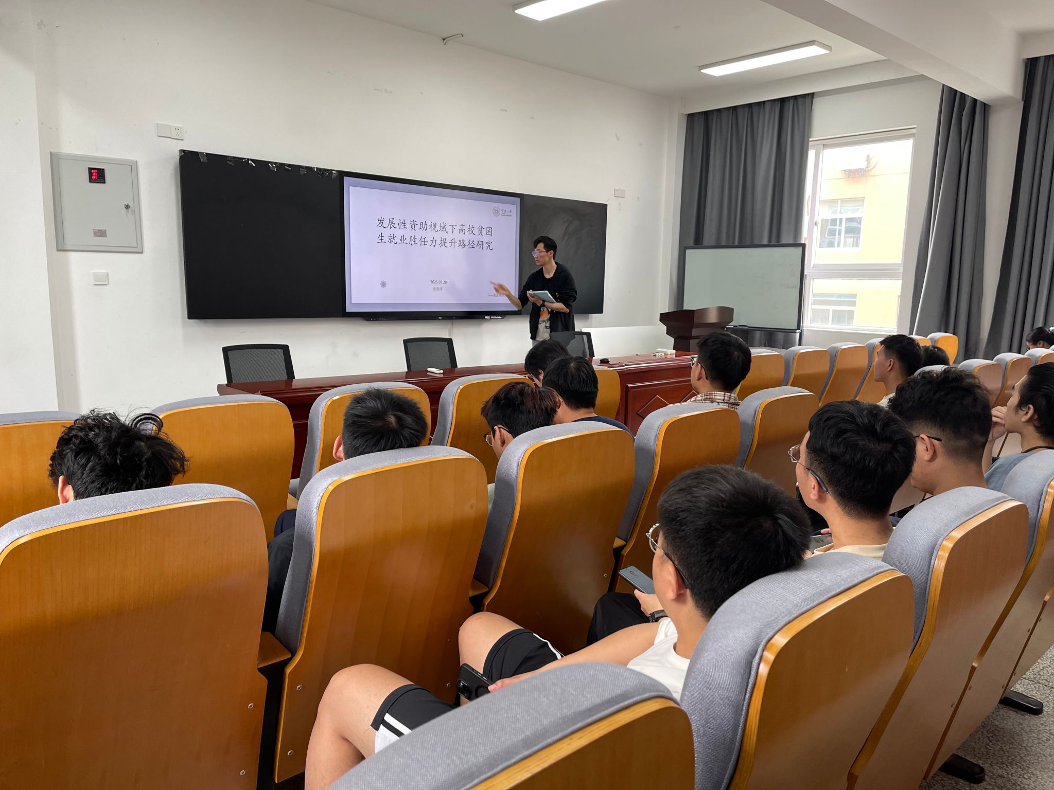 活动中,两位学生带来了精彩分享。第一位学生围绕“发展性资助视域下高校贫困生就业胜任力提升路径研究”展开论述。他深入分析了当前高校贫困生在就业过程中面临的挑战,指出专业技能不足、实践经验欠缺、职业规划模糊等问题。基于此,他提出借助学院平台,全方面提升职业能力,能够有效助力贫困生能够将专业与职业技能相结合,提高就业胜任力。这个项目也为学院进一步完善发展性资助项目提供了极具价值的参考。