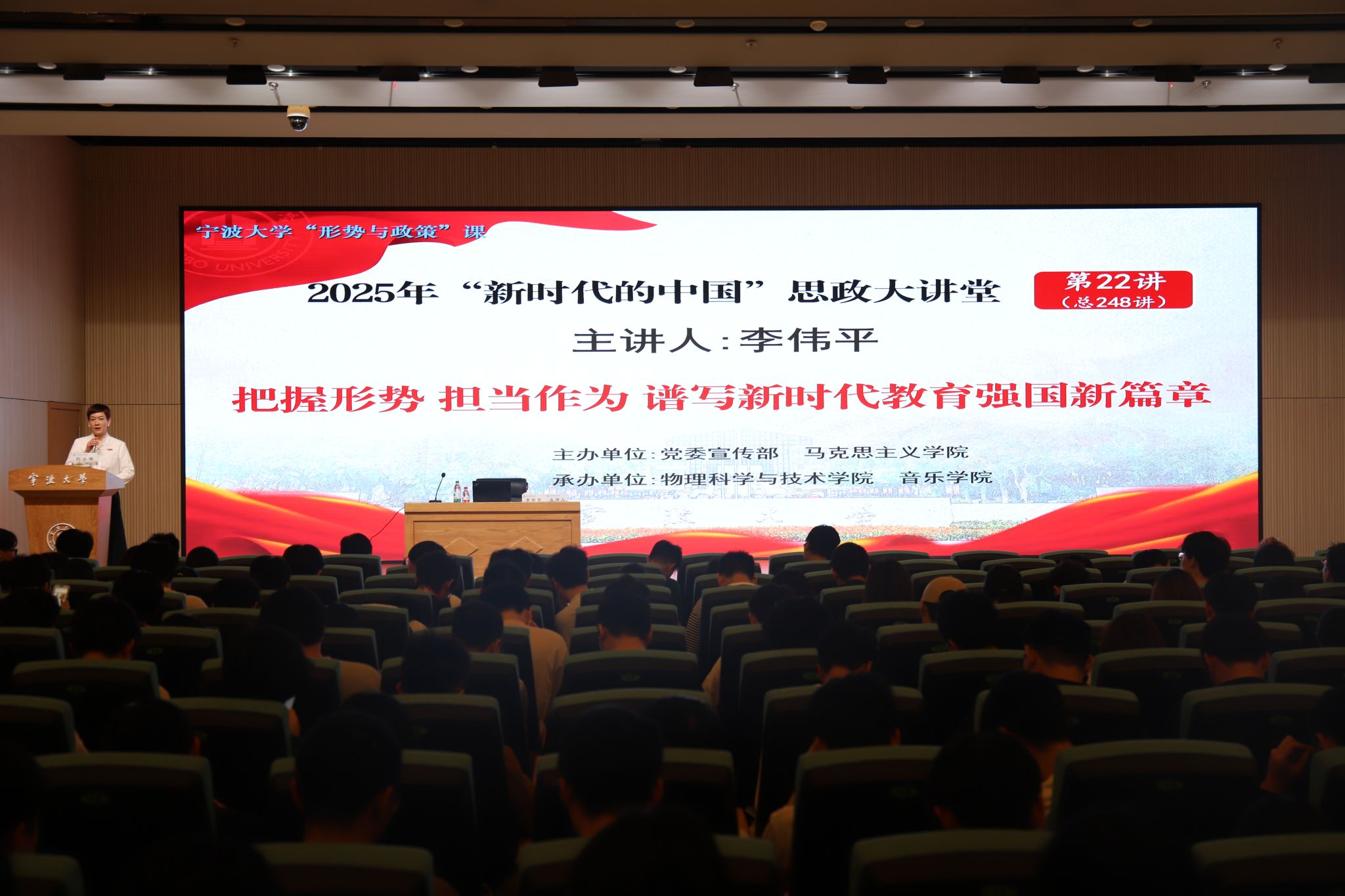 6月10日,李伟平副校长在朱学林报告厅“把握形势,担当作为,谱写新时代教育强国新篇章”为主题,为休闲小栈 和音乐学院360余名师生讲授“形势与政策”课。