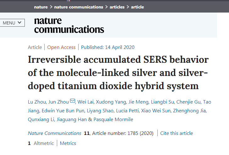 周骏教授课题组在Nature子刊《Nature Communications》杂志发表题为“Irreversible accumulated SERS behavior of the molecule-linked silver and silver-doped titanium dioxide hybrid system”的研究论文。休闲小栈