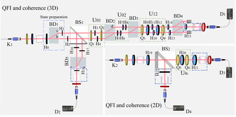 为了验证这一理论,研究团队精心设计并开展了一系列实验。在实验上实现了希尔伯特空间维数D=2和D=3系统下,QFI与量子相干性之间的关系。实验结果与理论预测高度一致,有力地证实了QFI与量子相干性之间的分解定律。这些实验不仅展示了量子相干性作为量子计量学中提升估计精度的资源潜力,还揭示了即使在无法直接测量最终态的情况下,仅通过分析初始态的量子相干性,也能够对参数估计的精度进行有效的推断。实验结果表明,在D=2情况下,通过选择特定的初始态和测量算符,可以实现对参数的最优估计。在D=3情况下,实验团队验证了分解定律的普适性,并在理论上证明了混态输入时QFI与初态相干性之间所满足的动力学关系。