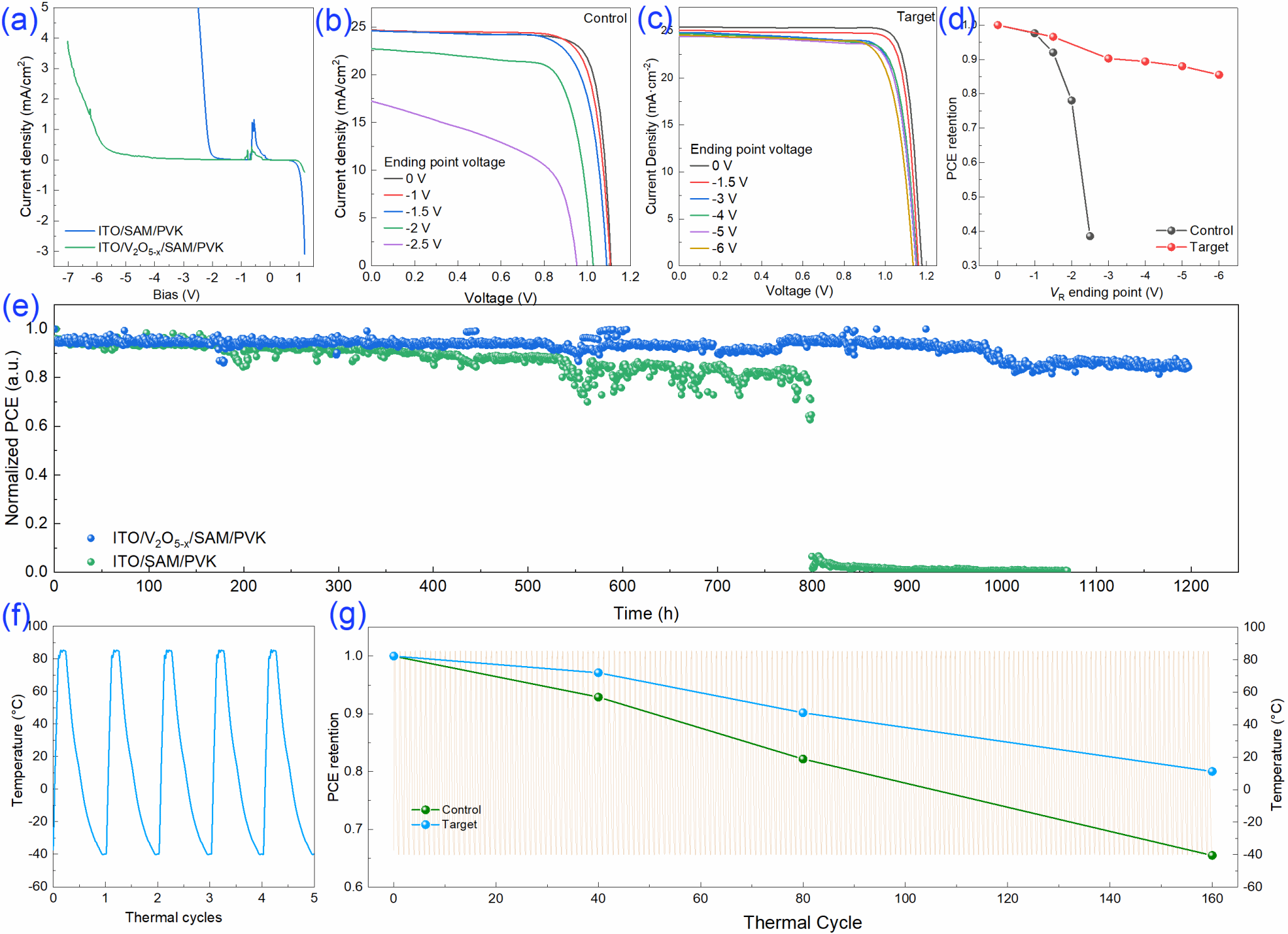 具体地,通过对V2O5薄膜的处理温度的系统改变来连续调控V2O5-x的氧空位浓度、掺杂浓度、缺陷密度、功函数和介电常数等光电特性,从而在最优温度下实现25.88%的光电转换效率。相比采用SAM或者NiOx的对照组器件,该优化器件的光伏性能、反向击穿电压、反向偏压稳定性、热循环稳定性和长期模拟太阳光光照稳定性均得到了不同程度的提升。