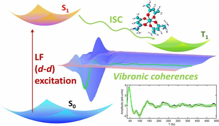 系间窜越(ISC)是过渡金属配合物中核心的非辐射衰变路径,对其在光催化、光电子学及光动力治疗中的性能起关键调控作用。系间窜越作为连接单重态与三重态激发态的关键通道,在贵金属(如Ru、Ir)配合物中,强自旋-轨道耦合(SOC)可在百飞秒内驱动该过程,确保高效的三重态布居。然而,3d金属配合物(如Fe、Co)的自旋-轨道耦合弱2-3个数量级,导致非辐射衰减速率快、激发态寿命短,严重限制了其光化学应用潜力。尽管近年研究发现振动耦合可弥补自旋-轨道耦合的不足,但配体场(LF)态的系间窜越机制仍不清楚——配体场跃迁常被强的金属-配体电荷转移(MLCT)吸收带掩盖,难以选择性激发和观测。