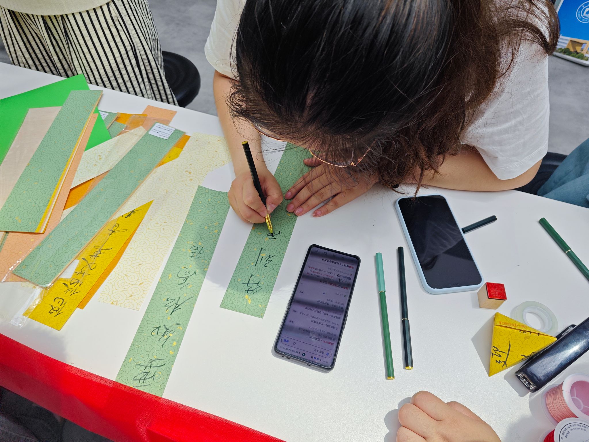 活动现场还设计了“制作一颗廉洁粽”手工环节首先是“系牢廉洁绳”,通过端午五彩绳的编织,鼓励同学们以廉洁自律为绳,将行动和思想紧密联系在一起。此外,同学们还精心挑选书法纸,写上廉洁寄语并将其折叠包成一个个“书法粽”。