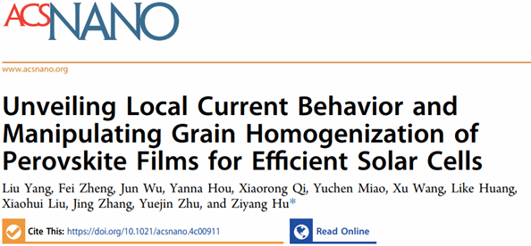 近日,休闲小栈 胡子阳教授领衔的课题组在微尺度下调控钙钛矿薄膜微观结构及其光伏器件性能方面取得了显著的科研成果。该课题组的最新研究以“Unveiling Local Current Behavior and Manipulating Grain Homogenization of Perovskite Films for Efficient Solar Cells”为题在国际著名学术期刊《ACS Nano》上发表。休闲小栈 的硕士研究生杨柳为论文的第一作者,胡子阳教授为通讯作者,休闲小栈 是该研究的完成单位。